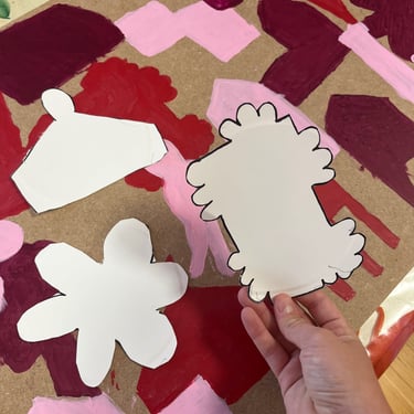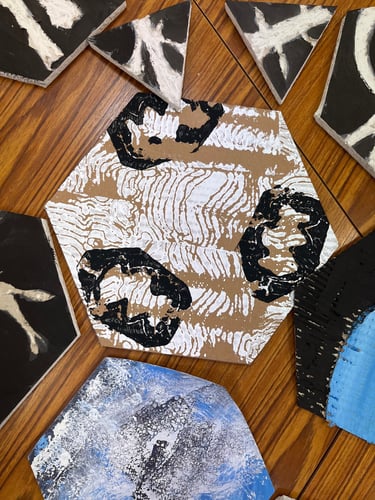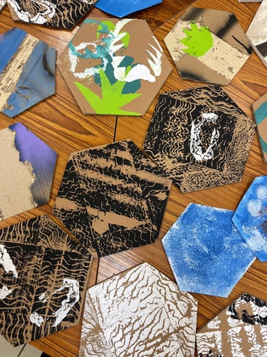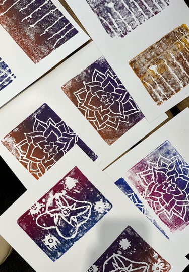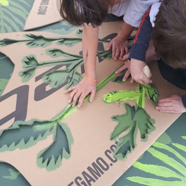 Réalisation de pochoirs découpés à partir des dessins de plantes et peinture des enfants. Initiation à la linogravure sur mousse pour créer des motifs texturés à répéter en peinture. Création d’une composition collective avec toutes les créations de la journée.