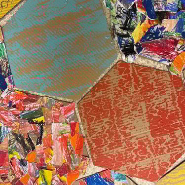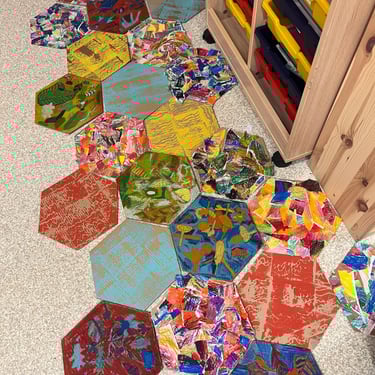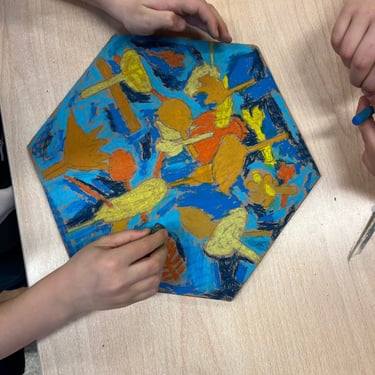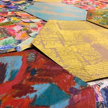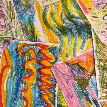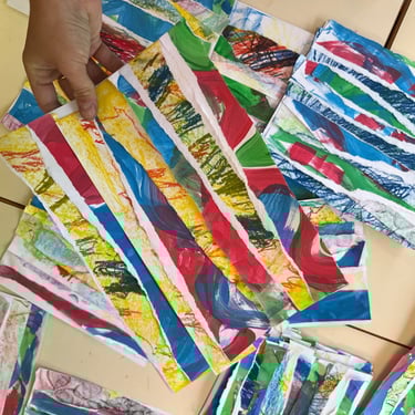 Réalisation de fonds colorés à partir de différentes techniques (craies, peinture, etc). Les élèves ont ensuite déchiré leurs productions pour créer de nouvelles compositions à partir des morceaux.