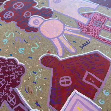 Dessins libres de maisons imaginaires. Peinture à partir de pochoirs des formes des maisons. Création de motifs graphiques à partir d’objets (bouton, fourchette, chouchous, etc)