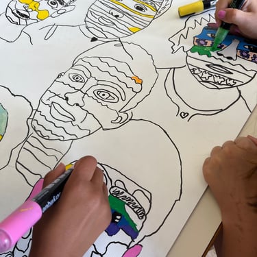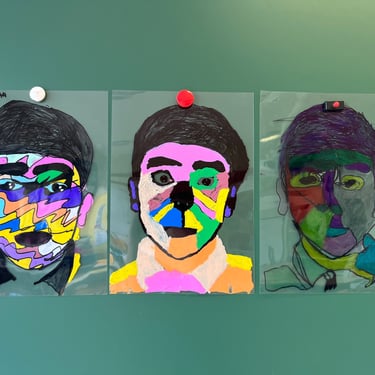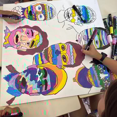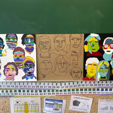 Exercices de dessins de portrait avec des techniques variées (points, mono ligne, avec la main inversée, les pieds, la main de son camarade, etc). Création d’autoportraits en couleurs à partir de leur photographie avec des outils et techniques variées (aplats de couleurs, contours, motifs, peinture, feutres, encres, etc)