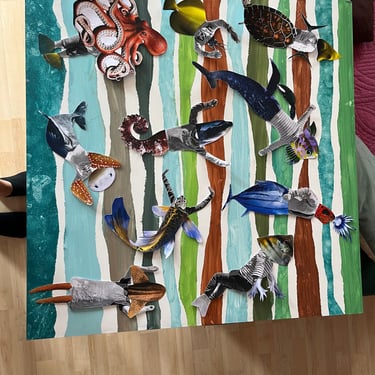 Création de fonds colorés en camaïeu de couleurs. Imagination de créatures fantastiques aquatiques à partir de photos des enfants et d’animaux marins.